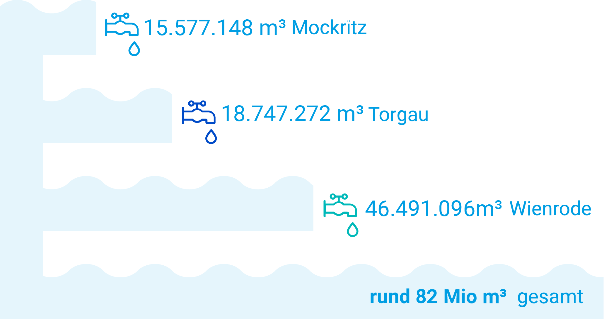 Wir fördern unser Rohwasser aus zwei unterschiedlichen Quellen: Das Trinkwasser für weite Teile des sachsen-anhaltinischen Raumes westlich von Dessau entstammt dem Reservoir der Rappbodetalsperre und ist mithin Oberflächenwasser. In Sachsen dagegen gewinnen wir Trinkwasser aus dem Uferfiltrat der Elbe und den Grundwasserreservoiren der Elbaue bei Torgau. Je nach Ursprung des Rohwassers kommen unterschiedliche Aufbereitungsverfahren zur Anwendung, die den Einsatz unterschiedlicher Zusatzstoffe beinhalten. Die Kerndaten der Trinkwassergewinnung in den einzelnen Wasserwerken inklusive der Angaben, welche Stoffe für welchen Zweck zur Anwendung kommen, zeigen Ihnen die folgenden Grafiken.